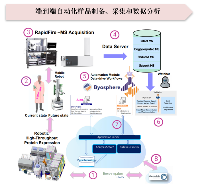 通过准确和快速的分子量水平的高通量质谱分析,在小分子、多肽和小蛋白的研发过程中是非常重要的一环。Sawyer 等人近期在PNAS(2020, 117, 9851-9856.)上证明了高通量质谱分析在抗体药物中的可行性。基于这项工作的推动,我们开发了一个完整的端到端 (E2E) 的管道,将 RapidFire-MS (RF-MS) 数据采集与生物制剂的实时信息学和数据相结合。实现了,我们可以整合生产、分析和信息学的内容,通过简化硬件和数据自动化分析来筛选完成例如>103~104个大分子的工作。我们将在下文中展示该方案和传统分析及现有生物信息学相比的优点。