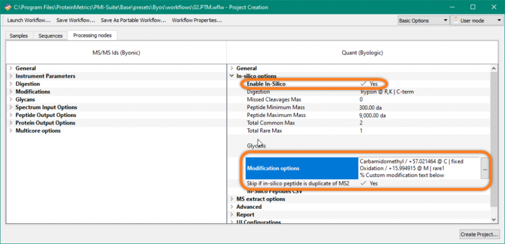 本期Protein Metrics Insights的主要内容: (1) 利用In-Silico peptides功能提取一级质谱(MS1)的XIC峰面积; (2) 最新版本Byos V3.7中同时标注去卷积完整谱图中的单同位素分子量和平均分子量。 1. 高级功能 In-Silico Peptides 在默认情况下,Byos大多数肽谱分析流程只对根据MS2谱图匹配到的肽段进行定量分析。有些时候,分析人员也会需要对没有MS2谱图匹配的肽段进行定量。这种情况可以用我们软件的in-silico peptides 功能实现。从广义上来说,in-silico是提取肽段XIC谱图的一种方式。这样即使MS2谱图缺失或者质量差的时候,也可以对肽段进行一致的定量。由In Silico鉴定到的肽段可以通过In Silico列中的“Yes” 标记很容易地与其他MS2鉴定到的肽段区分开。 Automated In-silico Generation via a Theoretical Digest(通过理论酶切自动生成In-silico肽段): 在创建项目的过程中,软件根据设置的In-silico酶切来生成包含所有预期肽段的列表。理论酶切允许用户查看和编辑修饰列表以满足不同的实验方法。 CSV In-silico Import(导入In-silico肽段的CSV文件): 项目创建过程中或者项目结束后,都可以导入包含In-silico肽段的CSV文件。 Add Missing via Existing(通过已有的肽段添加缺失肽段):在一个项目某些文件中找到的肽段,系统可以自动在其他文件中寻找相同肽段的信息。 Create New Peptide from Current(由当前肽段创建新肽段列表): 在当前已有肽段的基础上生成in-silico列表,可用于添加额外的电荷态和异构修饰。 With the introduction of our new Feature Finder tool(引入新的Feature Finder工具):用户可以对之前未鉴定的峰进行In-silico鉴定。 打开In-Silico Peptides分析功能的方法是: 在Workflow中的Processing nodes标签页中,找到“In-silico …