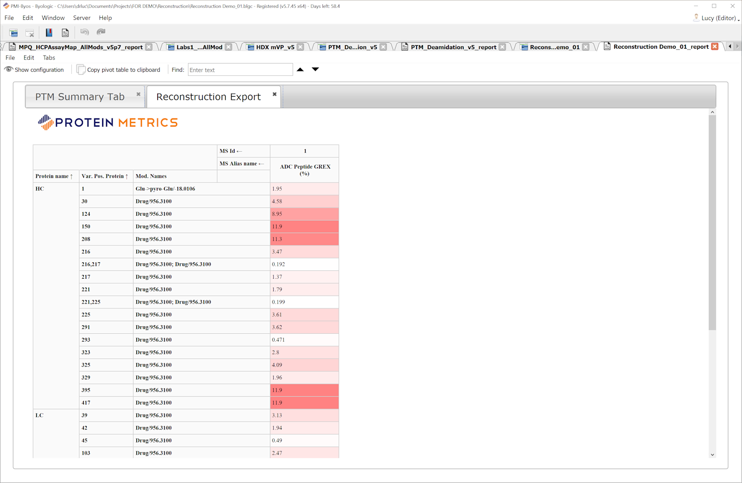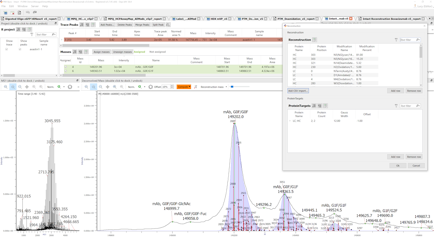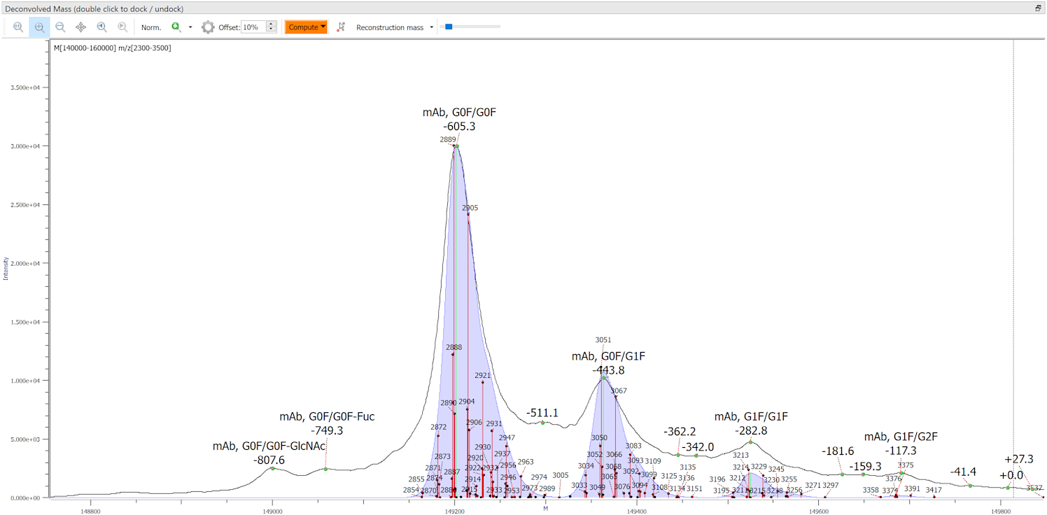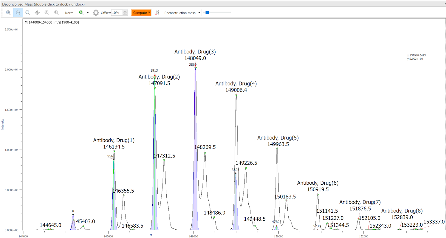 完整分子量与电荷变异体重构 将完整分子量分析所获取的信息与肽图谱数据相结合,可全面洞察蛋白质的修饰状况,进而更精准、细致地了解样品中存在的各类修饰。 修饰情况可视化呈现 完整分子量重构流程依据肽图数据中量化得出的修饰信息,构建出理论上的完整分子量质谱图,并将其与实验所得的完整分子量质谱图进行叠加展示。这种可视化手段使得研究人员能够直接对已识别的修饰进行比对和验证。 提高准确性与可靠性 借助肽段层面的数据来重构完整分子量质谱图,不仅增强了修饰分配的可靠性,还使得不同蛋白质形式的量化更为精确。这种精细程度在复杂生物治疗药物的表征过程中尤为关键。 简化操作流程 Protein Metrics软件能够自动执行完整分子量重构过程,有效减少人工干预,简化分析步骤。研究人员可便捷地从肽图谱项目中导出所需数据,并将其导入完整分子量项目中进行重构,从而打造出高效且用户友好的工作流程。 在生物治疗药物表征中的应用 完整分子量重构工作流程在生物治疗药物表征领域具有广泛应用,尤其在抗体偶联药物(ADCs)的分析中发挥着重要作用。准确量化修饰情况(如药物与抗体的比率,即DAR),对于评估ADCs的质量和疗效至关重要。 联系我们